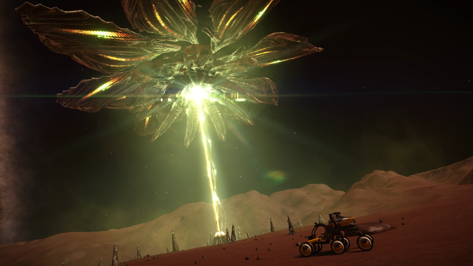 04 июня 3303 (2017) года были задокументированы первые взаимодействия между таргоидским перехватчиком и «наростами» в системе Pleiades Sector OI-T C3-7, и подтверждены, что они взаимосвязаны. Перехватчик подлетел к одной структуре, при этом вывел из строя все системы ближайших кораблей и ТРП сильным электромагнитным импульсом. Затем корабль выровнялся так, что его «корма» была совмещена с центральным «наростом», и начал некоторое время излучать или впитывать пульсирующий луч света или энергии. Затем, перехватчик улетел так же быстро, как и появился. Возможно, что «наросты» служат в качестве заправочных станций для перехватчиков, а метасплавы, которые они производят, являются топливными или ремонтными материалами для них. В настоящее время это только гипотеза.[4]