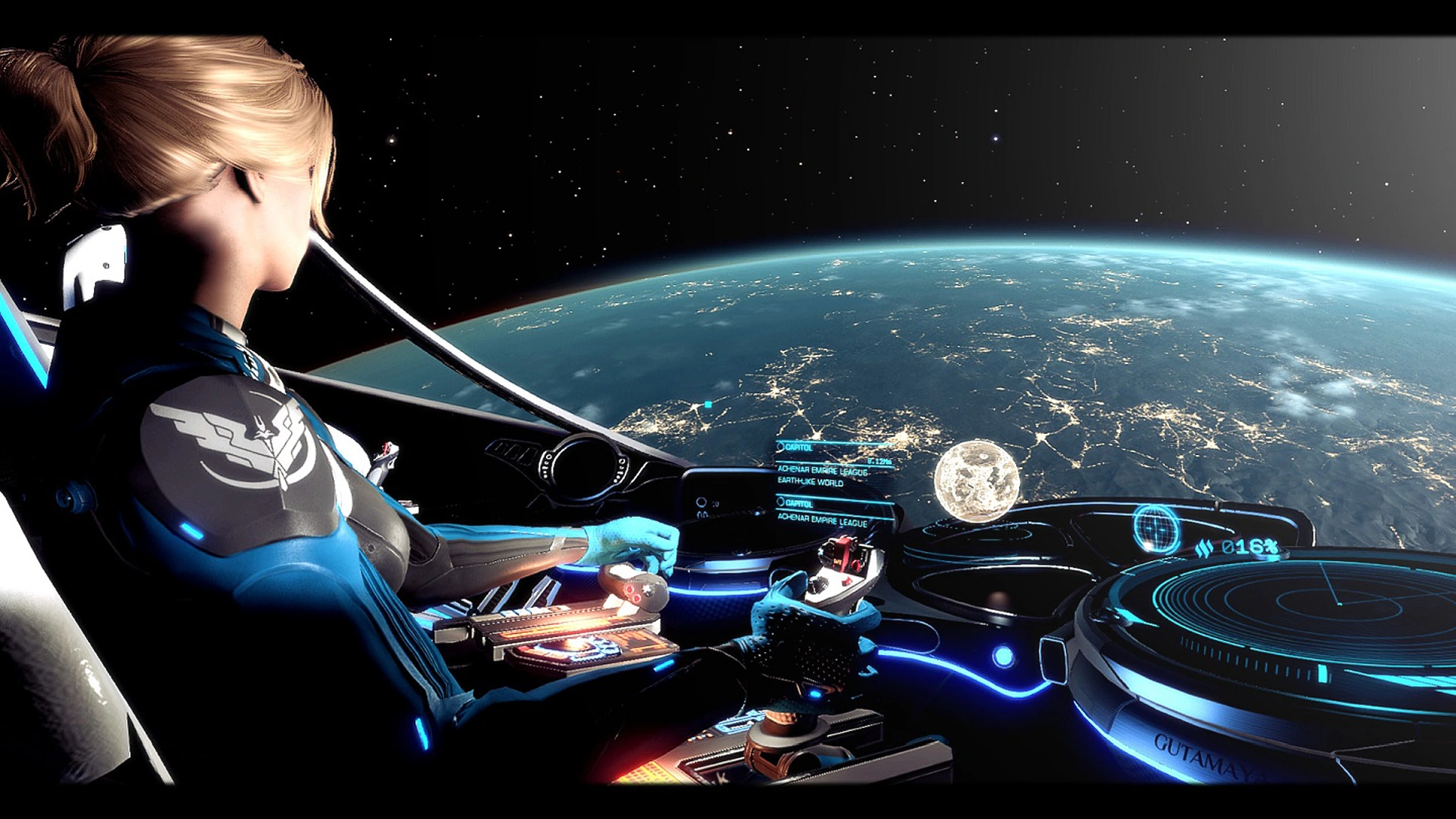 Multiple tourist beacons in orbit of the beautiful super-earth detail the history and origins of the Empire. For all intents and purposes, this planet is a second Earth, albeit 1.8 times as massive. This means the gravity is 40% stronger than on Earth, breeding sturdy people. It orbits the gas giant Achenar 6 in 823 earth days, however, rotates on itself in less than 18 hours. Though far from the giant it orbits, it is still eclipsed from the nearly indistinguishable Achenar star for a period of its orbit. The service-based Orbis space station Dawes Hub orbits this planet.[2]
