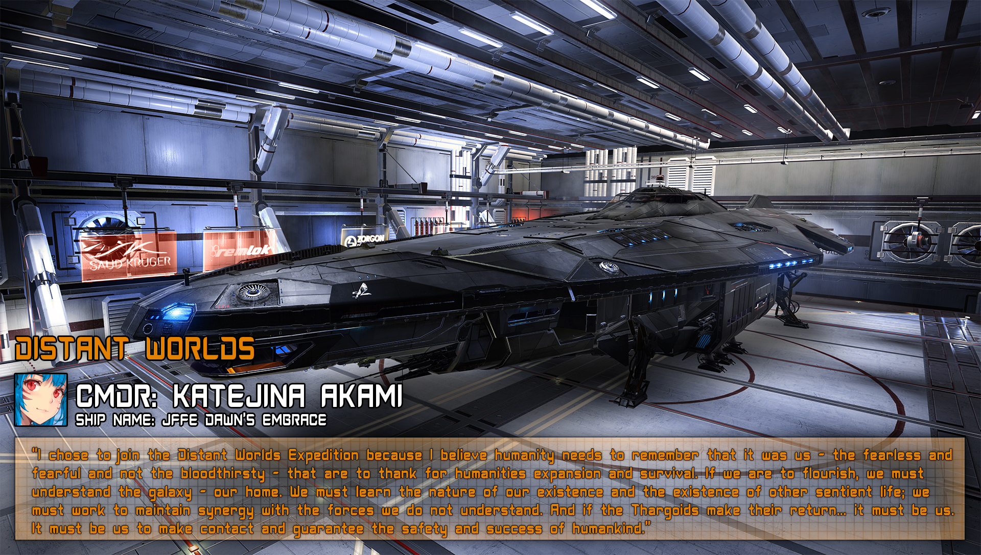 Since there were no CMDR avatars yet, CMDR Katejina started offering to create ship profile images for members on the expedition on request. They contained their ship, an Icon representing their CMDR, and the ship's name.