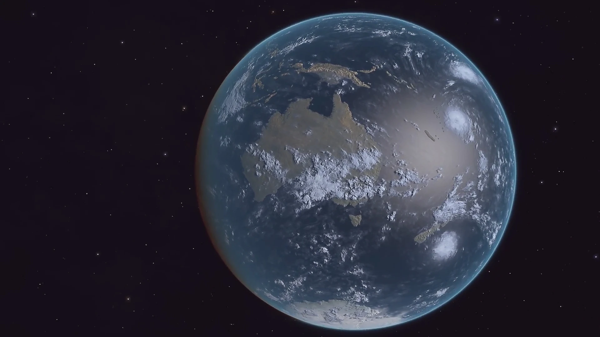 Over a billion years after its formation, things settled down. The planets all moved into their respective orbits, and Earth was no longer a fiery, hellish world. By now, Earth was a volcanic water world, possessing simple microbial life beneath its vast oceans. The atmosphere consisted of Nitrogen, Carbon Dioxide, and small amounts of Oxygen. It was on its way to becoming a haven for life.