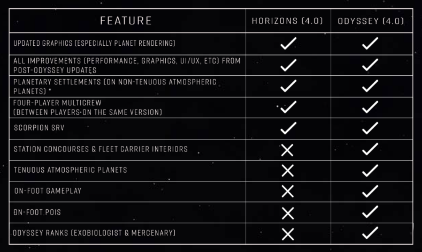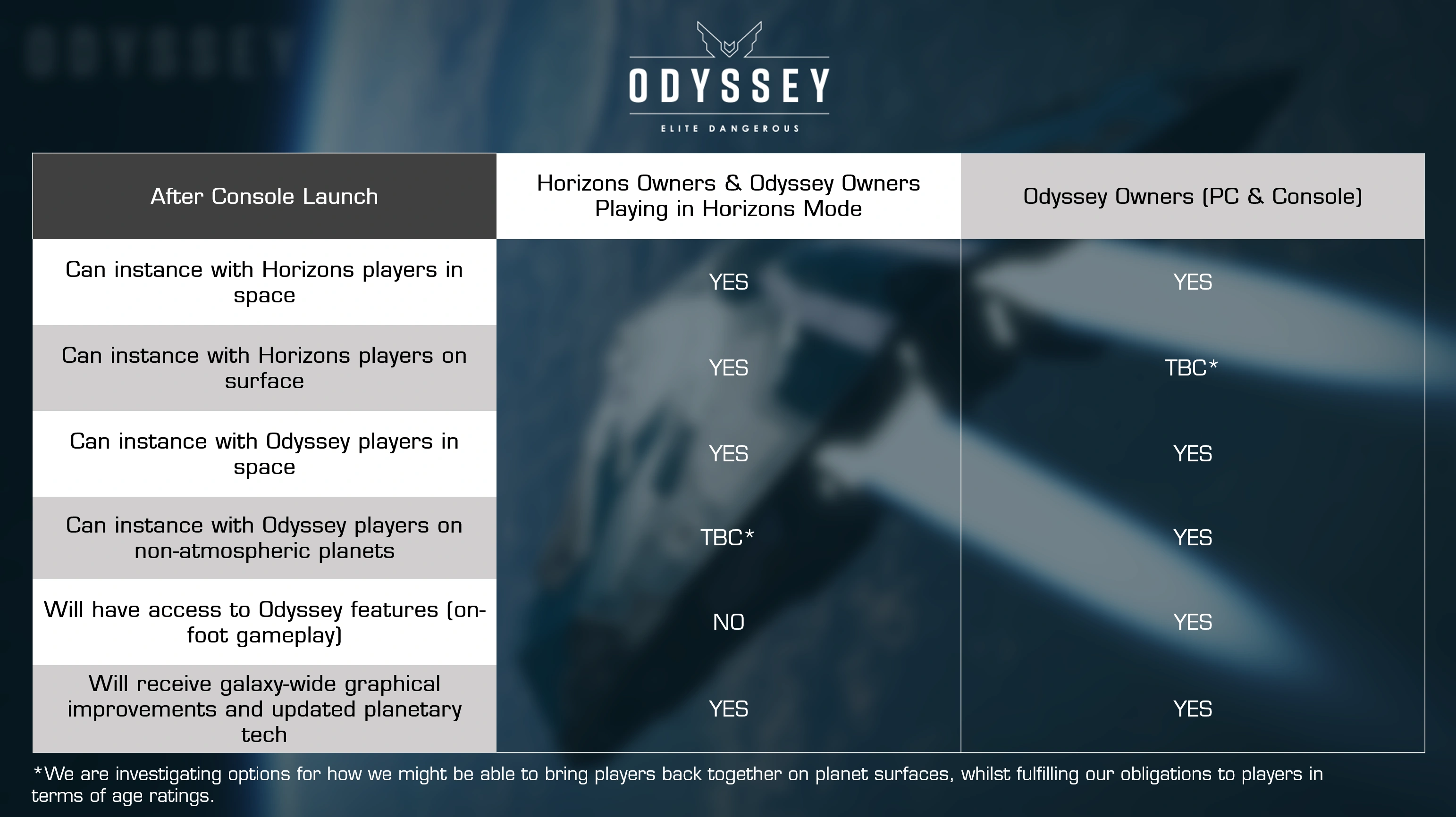 Elite Dangerous was updated to reunite both branches of the game. Odyssey and Horizons players can instance with each other, though Horizons players cannot land on planets with tenuous atmospheres because they are not able to obtain the required Advanced Planetary Approach Suite. However, Horizons players can experience the graphical update and planet-generation improvements of Odyssey.[24][25]