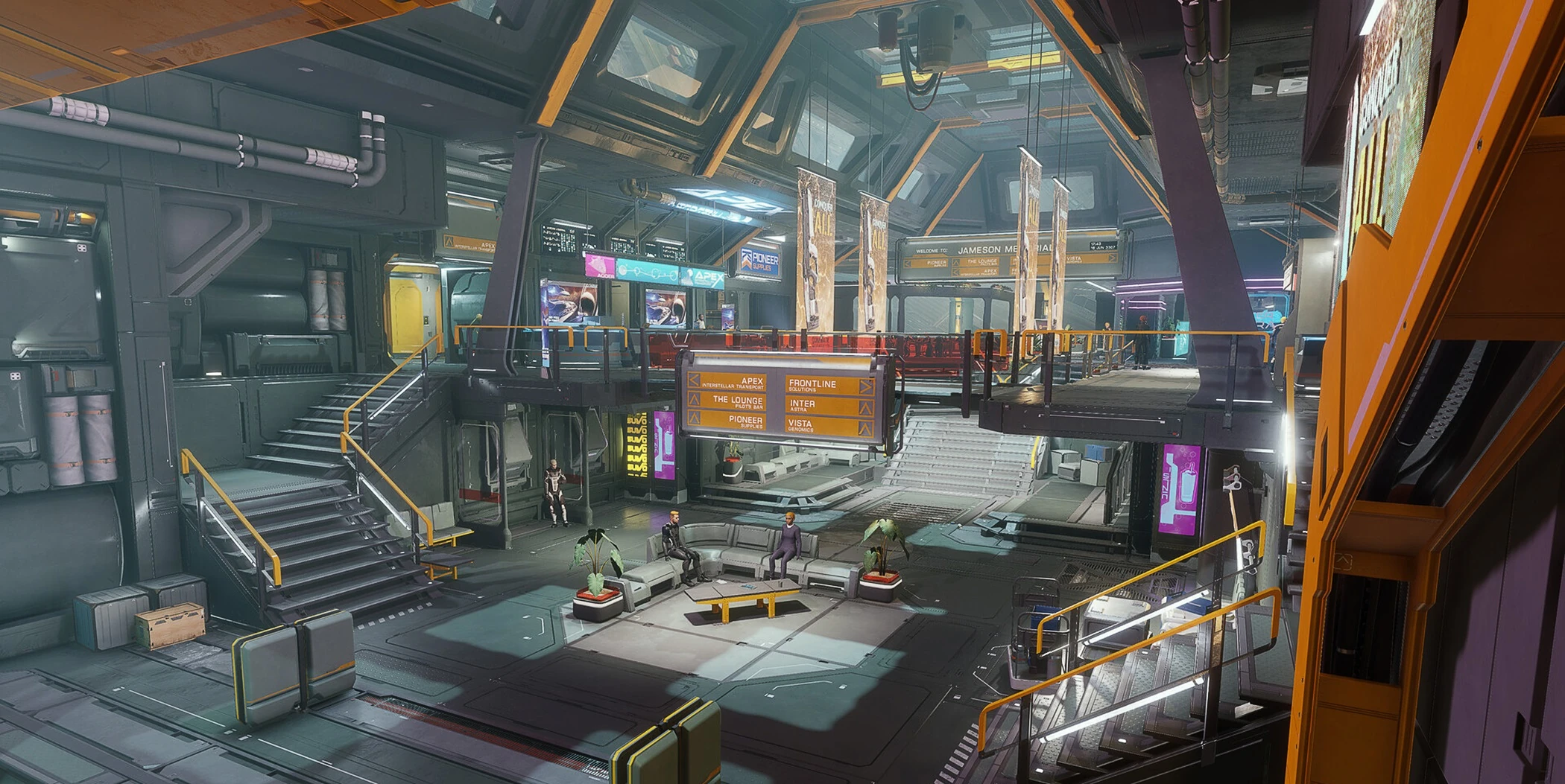 Starports, orbital Outposts, Asteroid Bases, and Planetary Ports are home to new Concourses, public common areas where players can meet with each other, take on missions, purchase equipment and ships, exchange or sell certain commodities, and redeem discoveries. All Concourses provide access to seven different vendors, each offering a unique service. Players can even travel from one Concourse to another, or to settlements, without the need for their own ship via Apex Interstellar Transport's shuttle service.[11][12][13] Players can also participate in large ground battles through Frontline Solutions.[10]