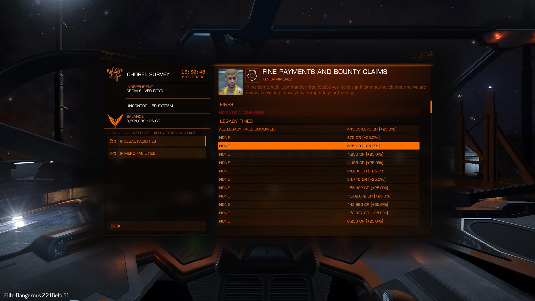 An Interstellar Factor is a station service that allows pilots with zero Notoriety to pay off or clear any outstanding fines and bounties attached to their ship regardless of where the fine or bounty was acquired, or to redeem any Bounty Vouchers and Combat Bonds.[1] These services come at a cost, however: the Interstellar Factor requires an additional fee of 25% of the value of any transactions they perform. This will increase the cost of clearing fines and bounties by 25% of their normal value, and will subtract 25% of the value of any redeemed vouchers and combat bonds. The advantage of Interstellar Factors lies in their convenience as a hub to claim or pay off large quantities of fines, bounties, and combat bonds from multiple different systems at once.
