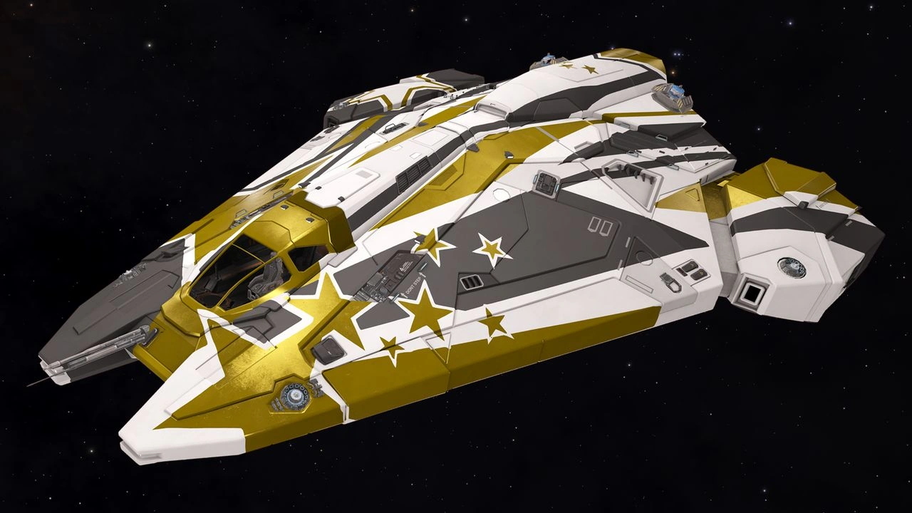 A series of paintjobs with stripes and stars. Two paintjobs, Acceleration White and Acceleration Gold, were produced for certain ships and rewarded to the top 75% and top 25% participant tiers, respectively, of a series of Community Goals related the Galactic Summit that were held between February 25 and March 11, 2021.[13][14][15]