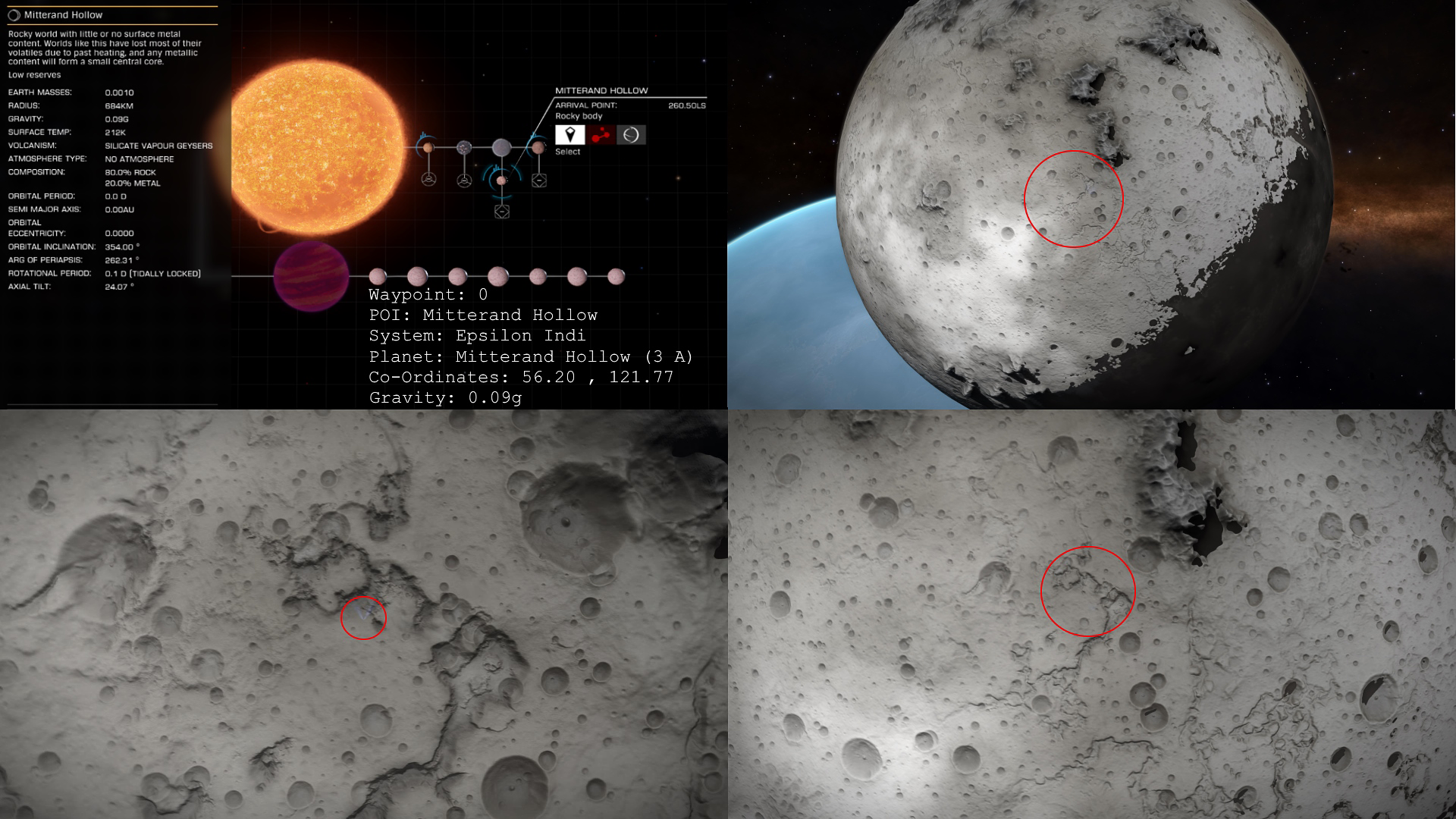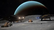 Mitterand Hollow is a small, rocky moon orbiting the planet New Africa in the Epsilon Indi system, near Sol. It has a radius of 684 km, and travels at an approximate speed of 876 km per second, allowing it to complete a full orbit around New Africa in only 1 minute and 26 seconds. A total Solar Eclipse is visible from the moon's surface every local day for 10 seconds.[1] Despite the moon's immense speed, pilots can still safely land on it and their ships cannot be smashed by its motion once they are mass locked.