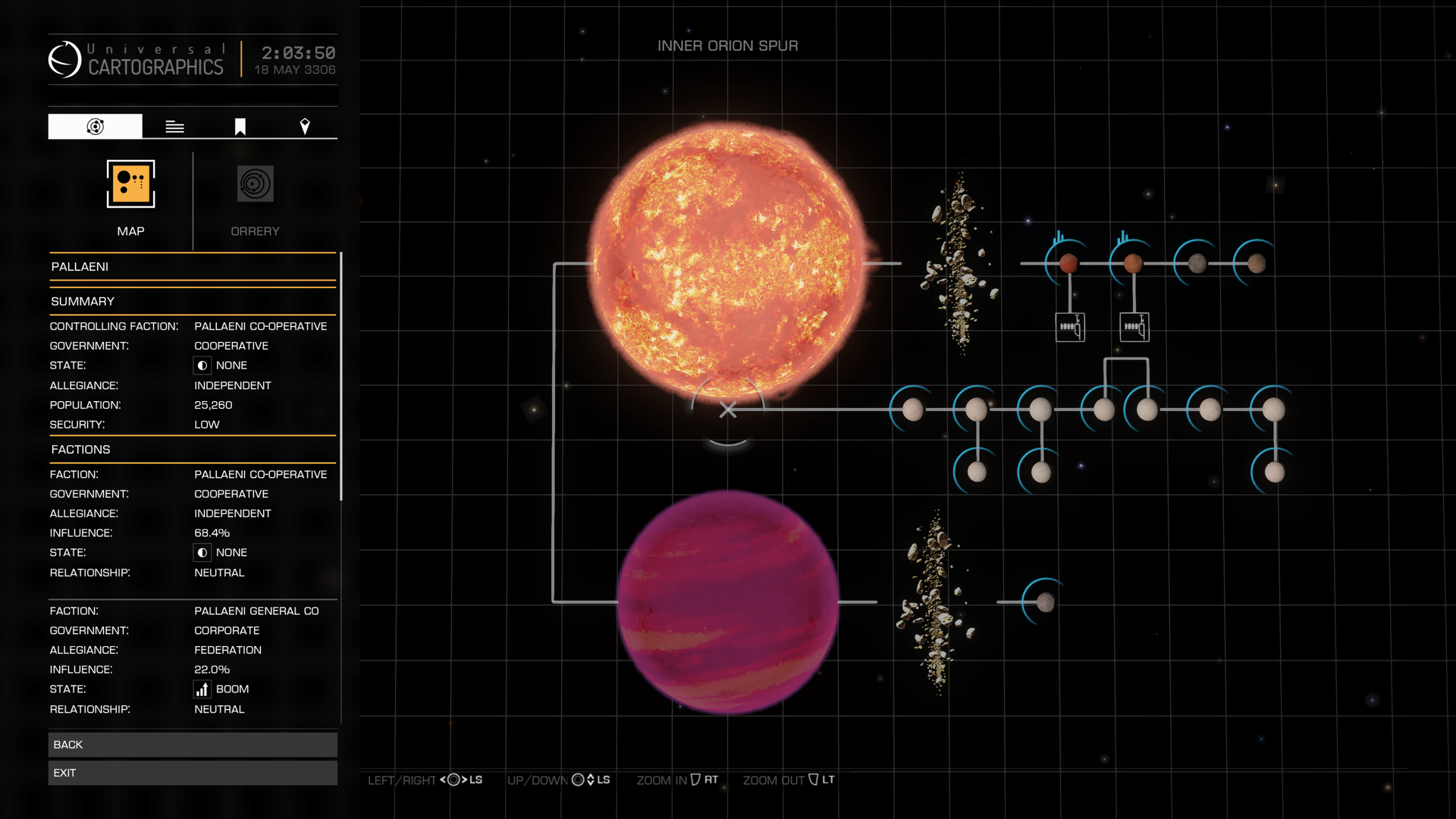 Pallaeni is an independent system in the Core Systems within the Inner Orion Spur. A quiet, backwater mining colony, Pallaeni achieved fame as a hub for explorers due to it being used as the starting point for three significant expeditions to Beagle Point: CMDR Erimus Kamzel's first of its kind expedition across the galaxy in 3300, Distant Worlds in 3302, and Distant Worlds II in 3305. In late 3302, Pallaeni also briefly served as the headquarters of the Colonial Marines, a minor faction established to provide armed escorts for pilots making the trip to the then-fledgling colony of Colonia.[1]