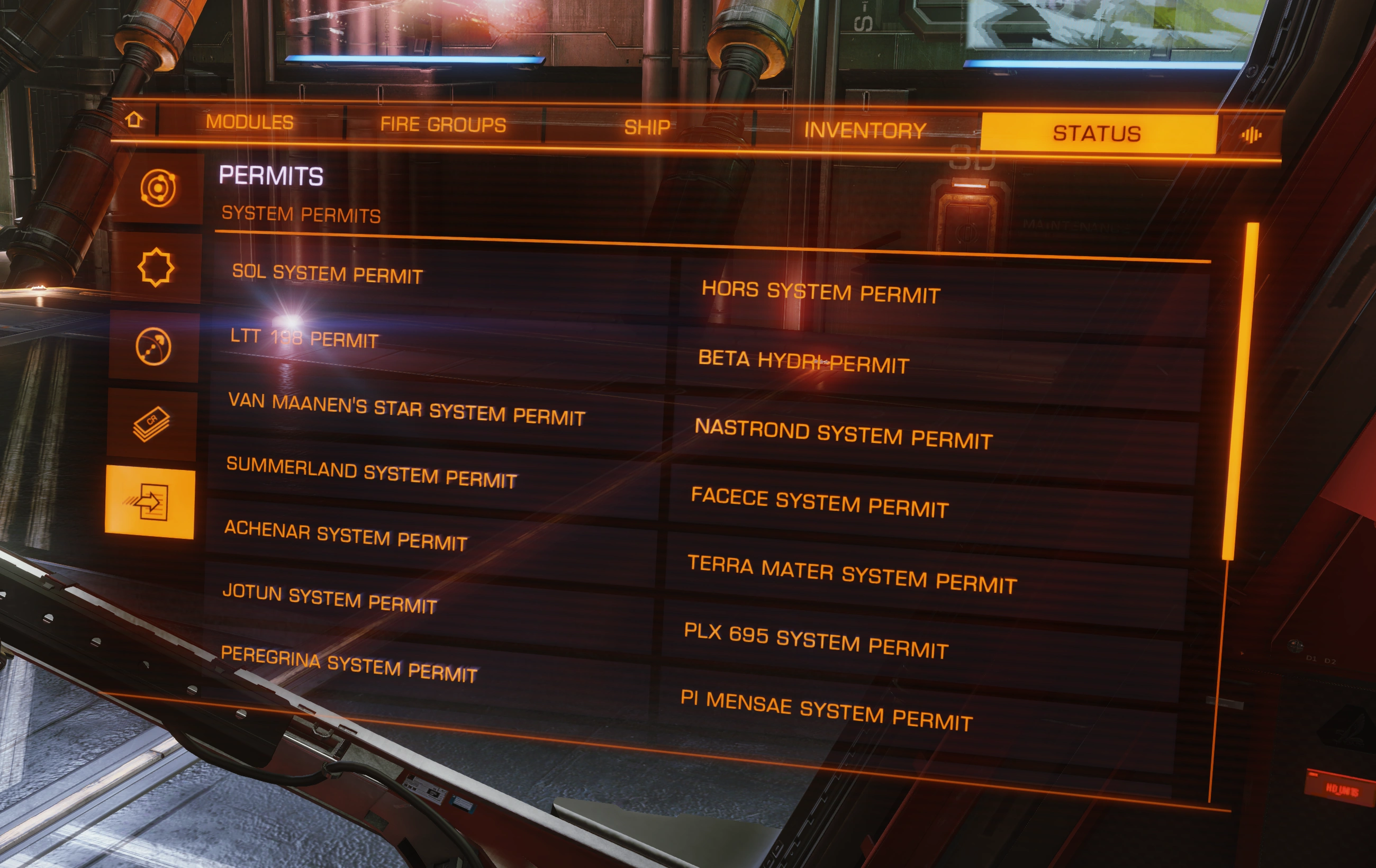 Permits enable travel to permit-locked star systems and landing on permit-locked planets. Commanders can check which permits they have in the Permits section of the Status tab on the right HUD panel.