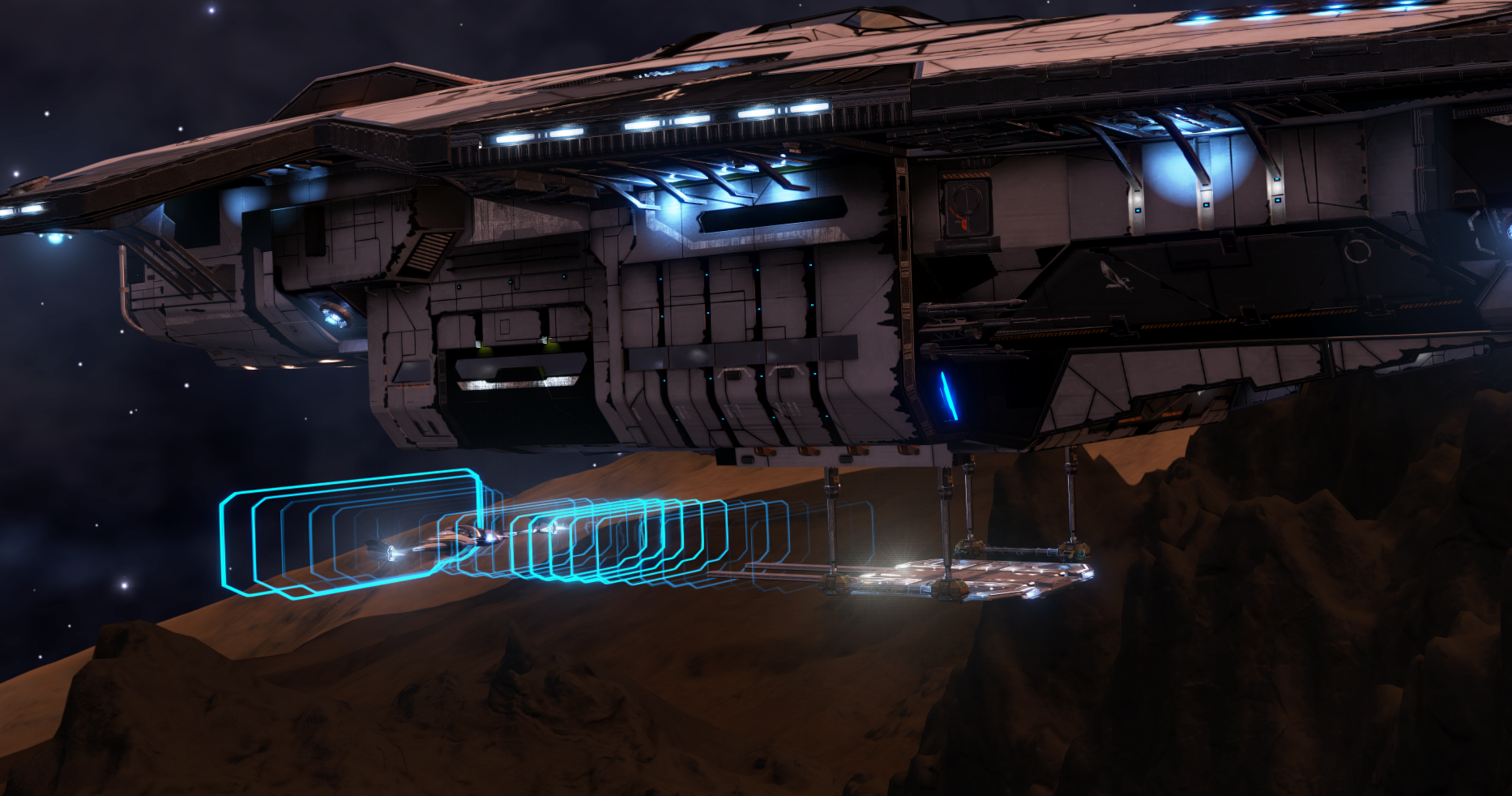 When docking with the mothership, the SLF must be flown through blue holographic guide rings under the ship.
