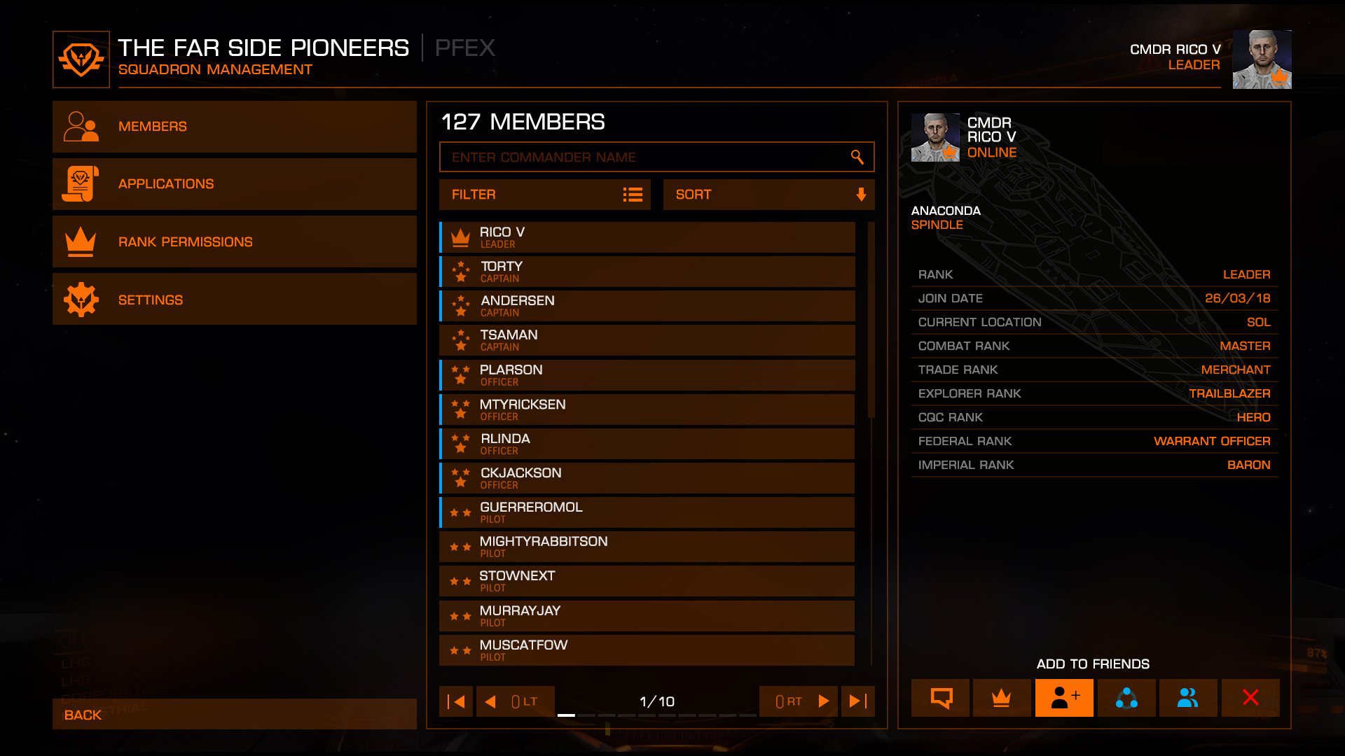 There are five Squadron ranks. The Squadron Leader can customise each rank's name and privileges. The default ranks are: