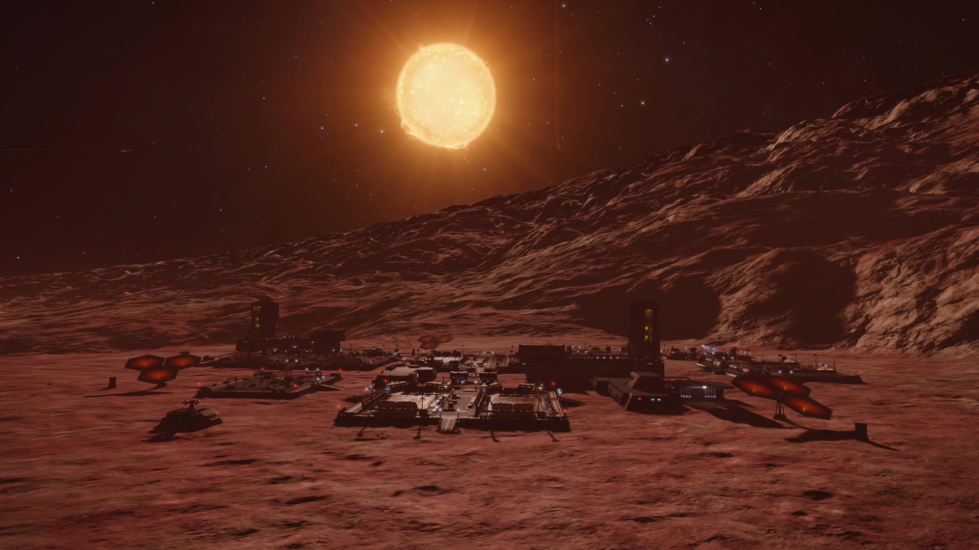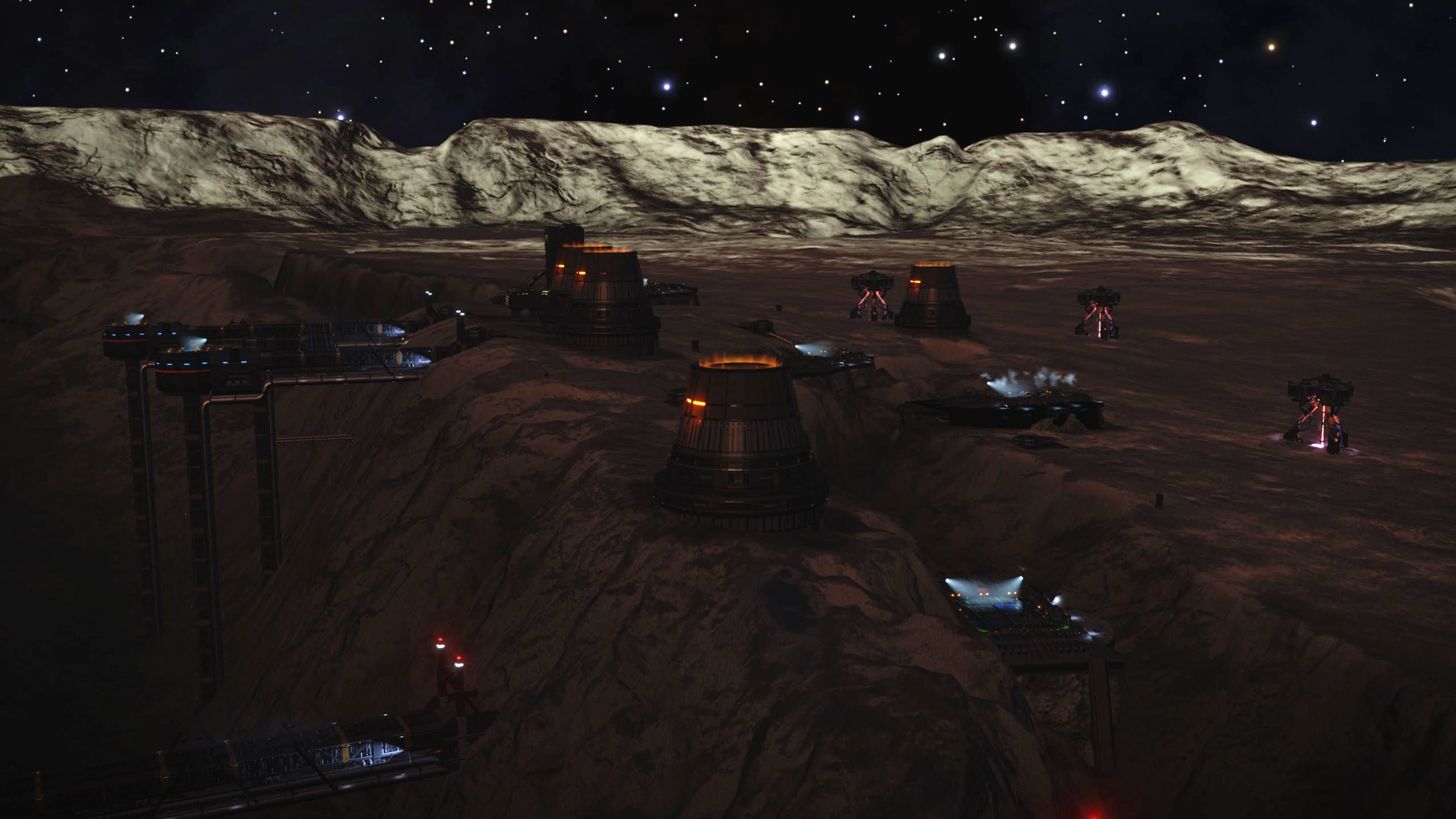 Planetary Outposts are small Surface Ports most commonly found in low-population systems with slow economies, as well as the most common type of Surface Port. They have a variable number of Landing Pads and multiple unique layouts. In general, Landing Pads are scattered in clusters around a series of habitation structures, cargo holding facilities, and roads, with defense turrets installed on the outskirts. Skimmers patrol throughout the area.