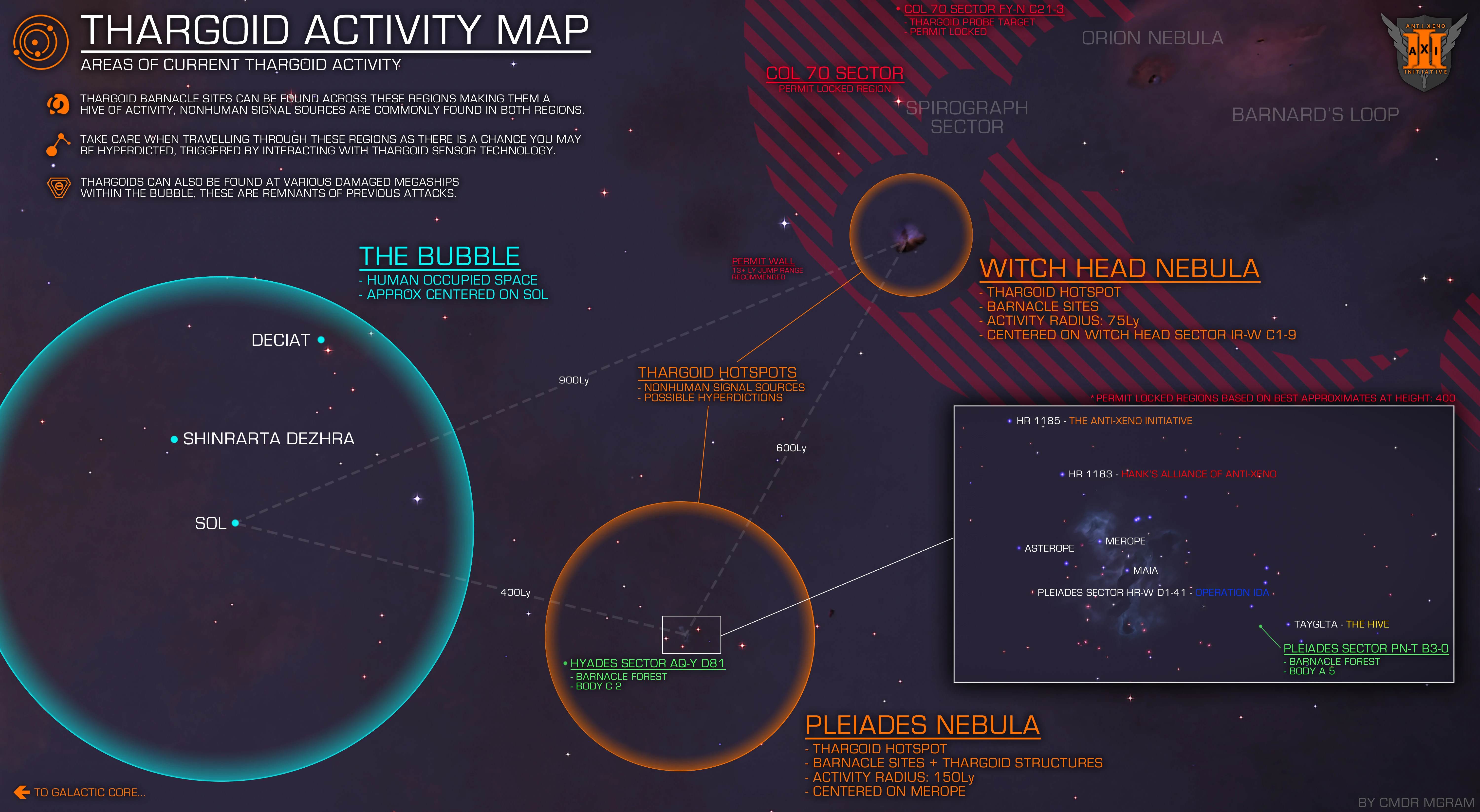 The Thargoids claim territory by seeding planets and moons with Thargoid Barnacles to produce Meta-Alloys to support their activities in the area. They have an affinity for systems with Ammonia Worlds that are in or near nebulae. To date, the Pleiades Nebula,[43] Witch Head Nebula,[44] Coalsack Nebula,[45] California Nebula,[46] and two large permit-locked regions in the Col 70 Sector of the Spirograph Nebula[47] and the Cone Sector of the Sanguineous Rim[48] have been identified as Thargoid territories, and have high concentrations of Non-Human Signal Sources.