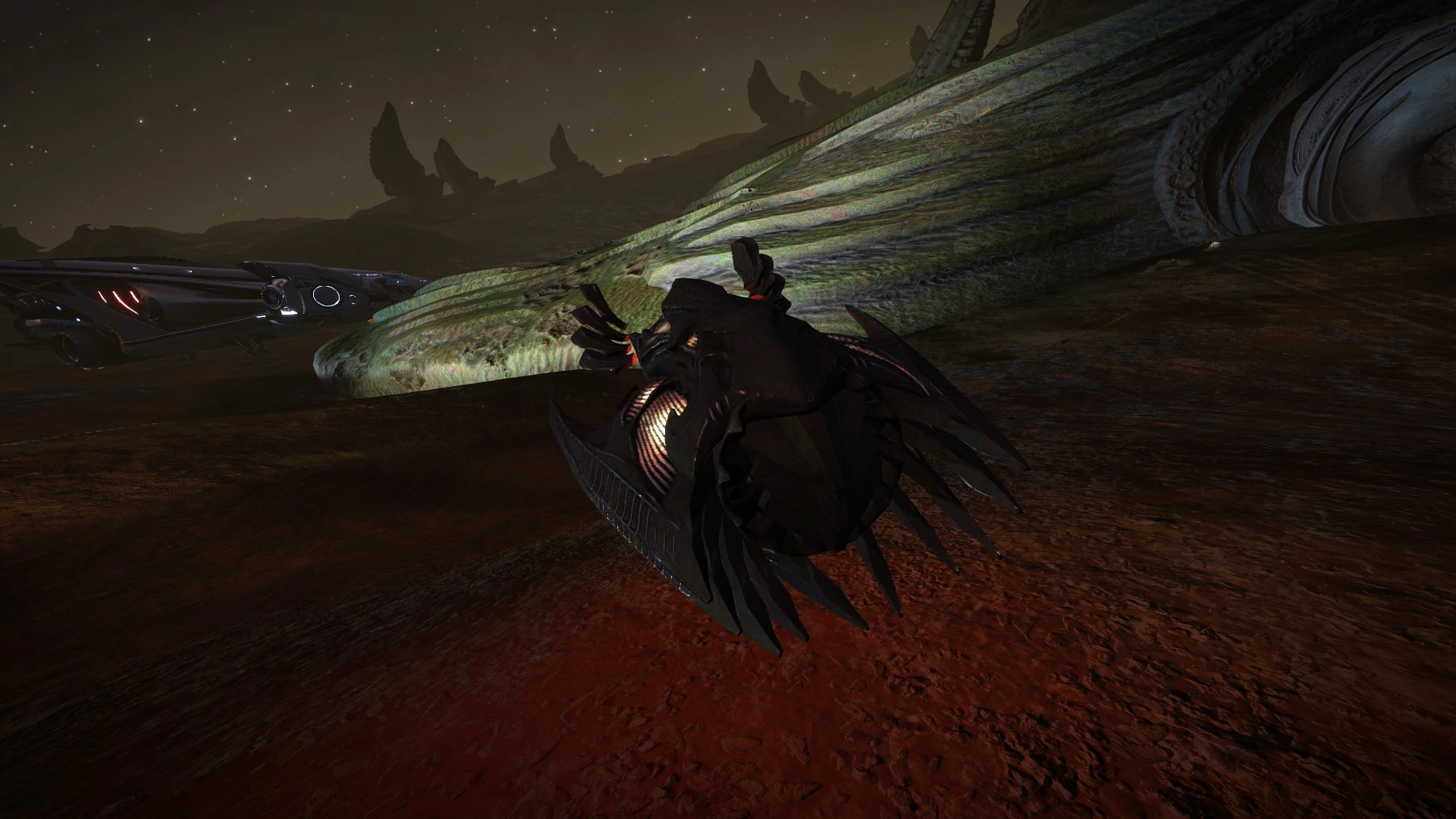 The Thargoids are an ancient, sapient, insectoid species of enigmatic origin. Data obtained from Ancient Obelisks built by the Guardians indicates that the Thargoids are several millions of years old, and likely a far older species than the Guardians.[2][5] Professor Cora Shaw of the Palin Institute concluded that they were an established spacefaring species long before they encountered the Guardians. They have an affinity for ammonia-based worlds. This suggests they may have evolved in a harsh, low-temperature environment, which might explain their overdeveloped survival instincts and aggressive nature. The Thargoids are experts in bioengineering, so they may have augmented their own biology to a point where natural evolutionary processes are meaningless.[6]