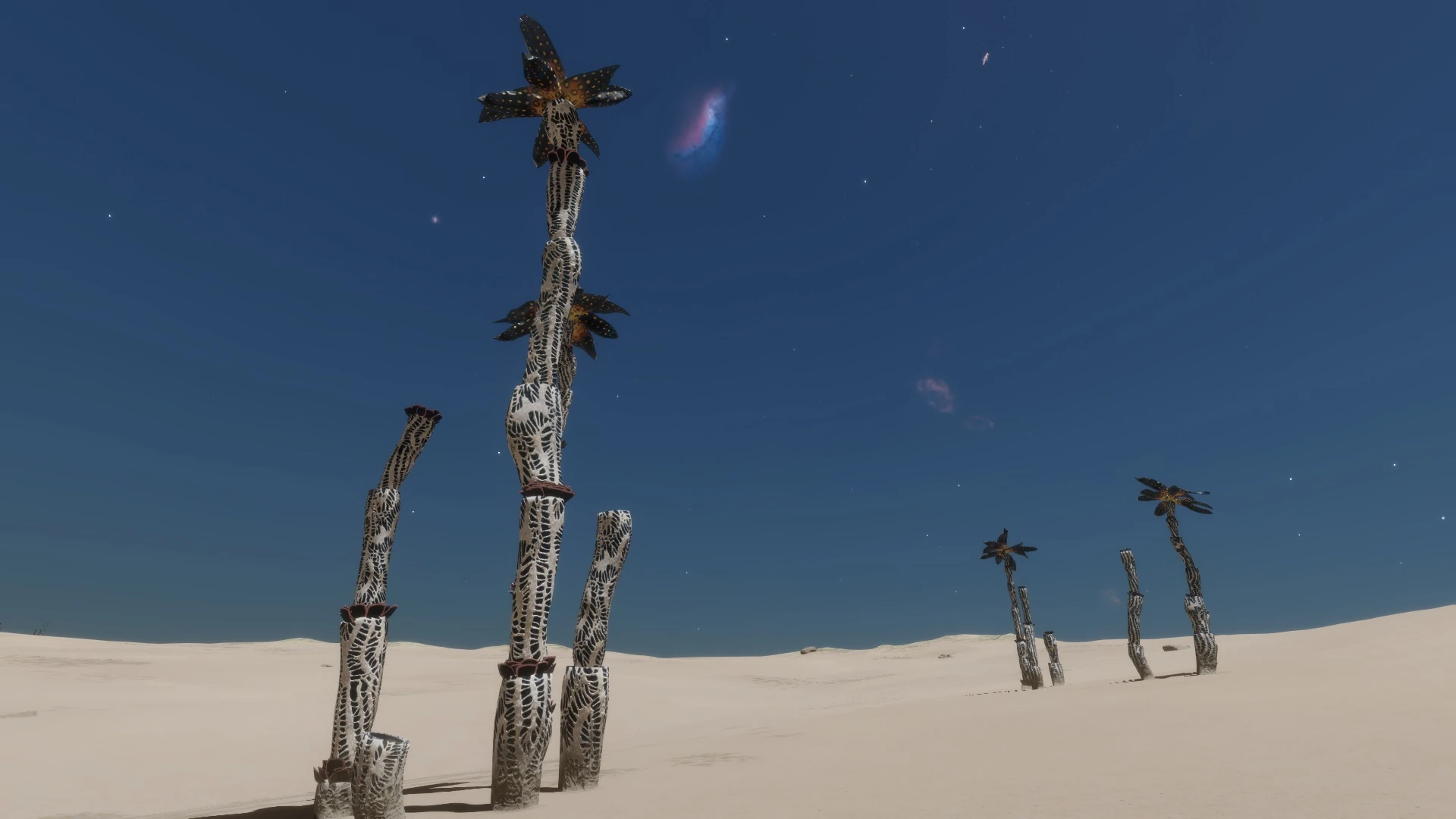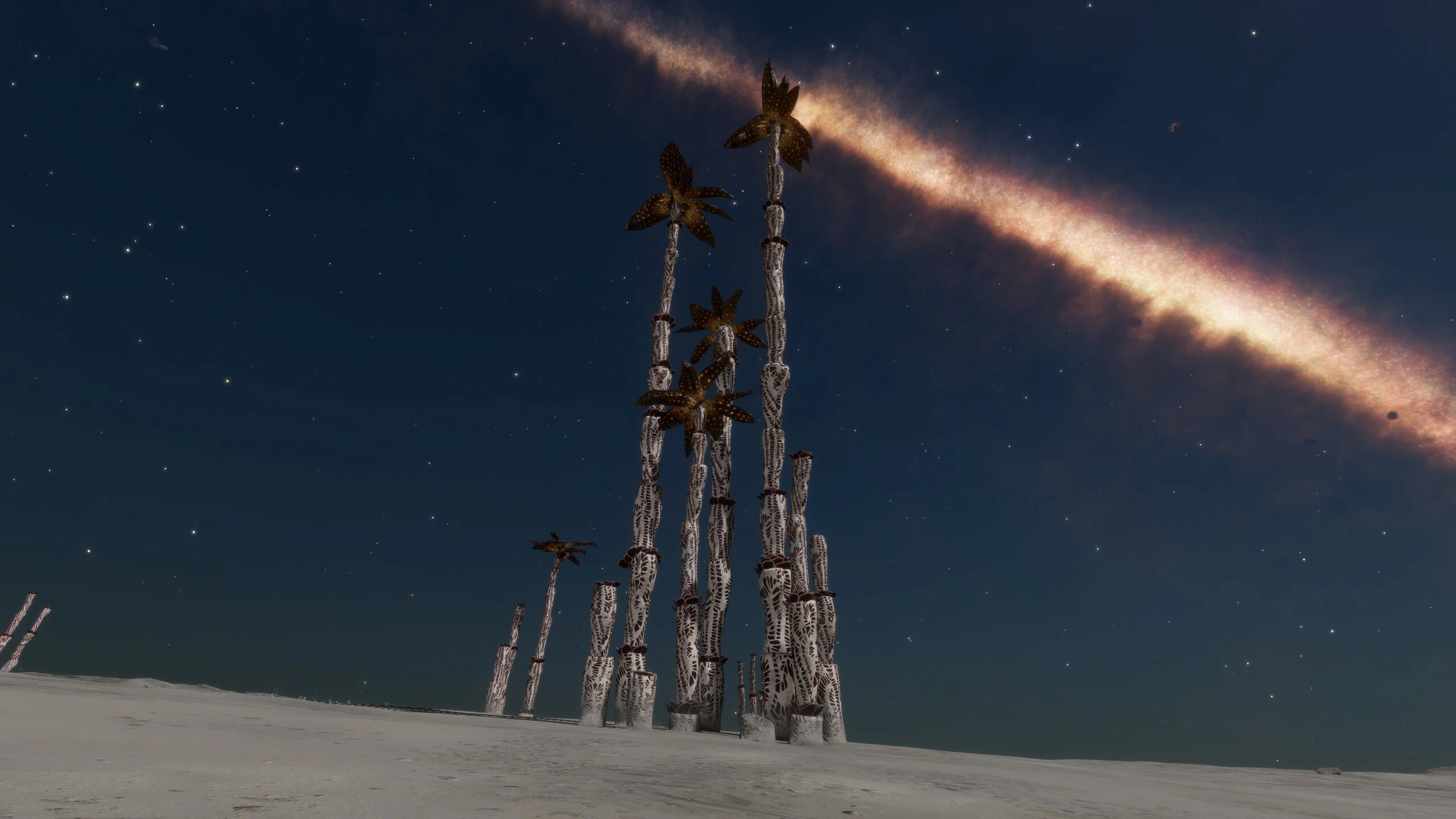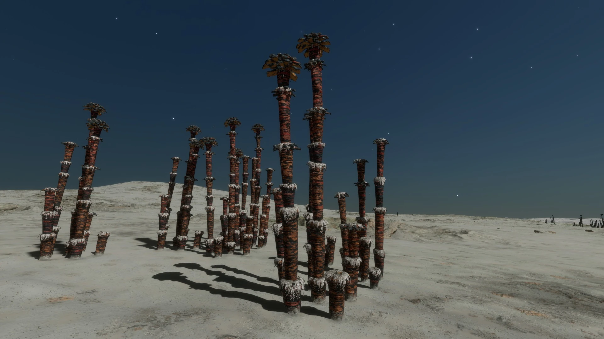 Highly specialised organisms that can grow to extreme heights, which peak when in a mature state. The organism's height and ability to survive is largely constrained by gravity. The lack of any real atmospheric weather has not put evolutionary pressure on the towers to be strong, so they form tall but thin structures which cannot be supported in high-gravity environments. The tower is formed from wrapped leaf-like structures, which create a regulated chimney void. This is used by the organism to create and maintain an artificial internal atmosphere, where discrete chemical processes can be undertaken along the length of the tower. Waste gases and other material may be released from the top of the tower. Some species feature external rings that can be used to gauge an organism's age.