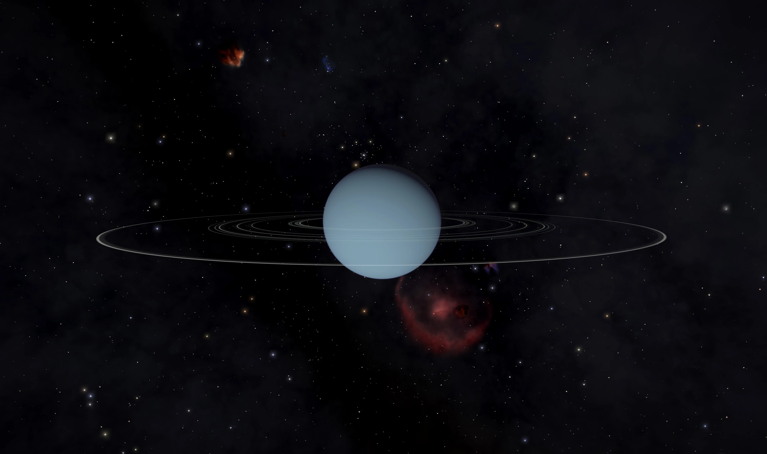Uranus is the 7th and coldest planet in the Sol system. Temperatures on its surface, mainly composed of icy gases such as Ammonia and Methane, can reach an icy -371° F. Uranus' extreme axial tilt of nearly 90° means it orbits Sol on its side. It possesses a thin ring system, thinner than Saturn but thicker than Jupiter.