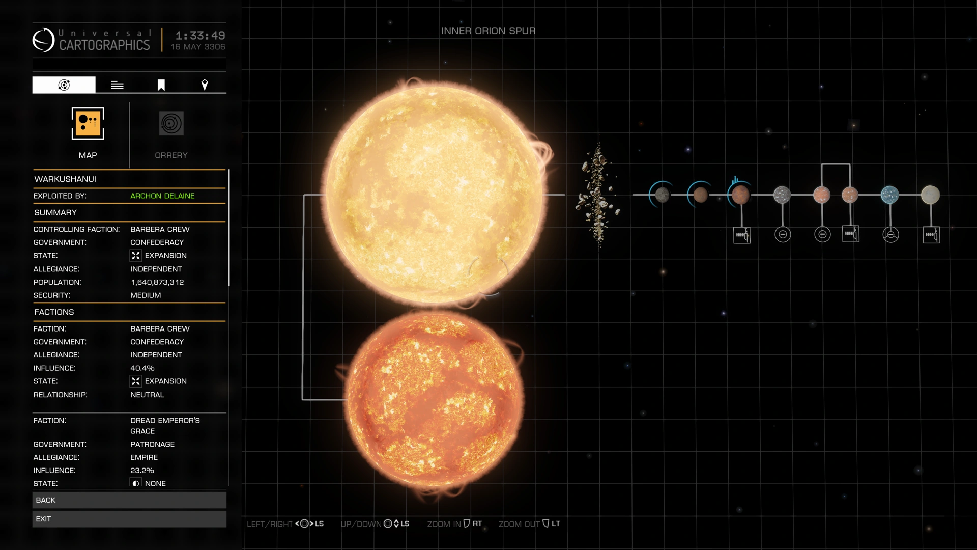 Warkushanui is an Independent system in the Core Systems within the Inner Orion Spur. In October 3301, it became ground zero for a wave of technical issues affecting its starports that soon appeared in dozens of other systems across inhabited space. The technical issues were eventually traced to the illegal trade in Thargoid commodities, such as the Thargoid Sensor and Thargoid Probe, which would automatically break down surrounding technology that was not protected by Meta-Alloys to sustain themselves.