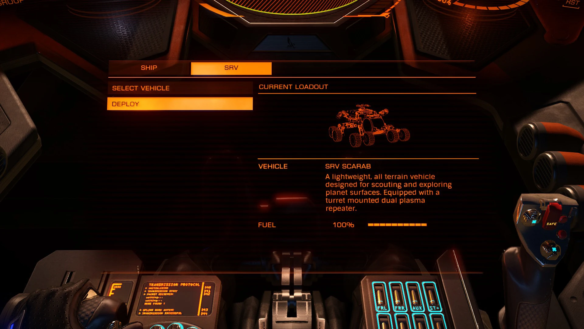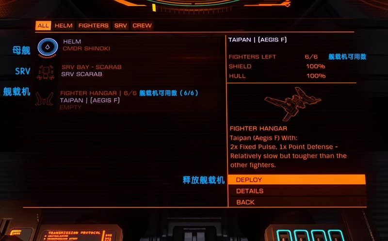 角色面板(下面板,或『3號面板』)會顯示飛船的大致資訊,也可用來管理SRV。