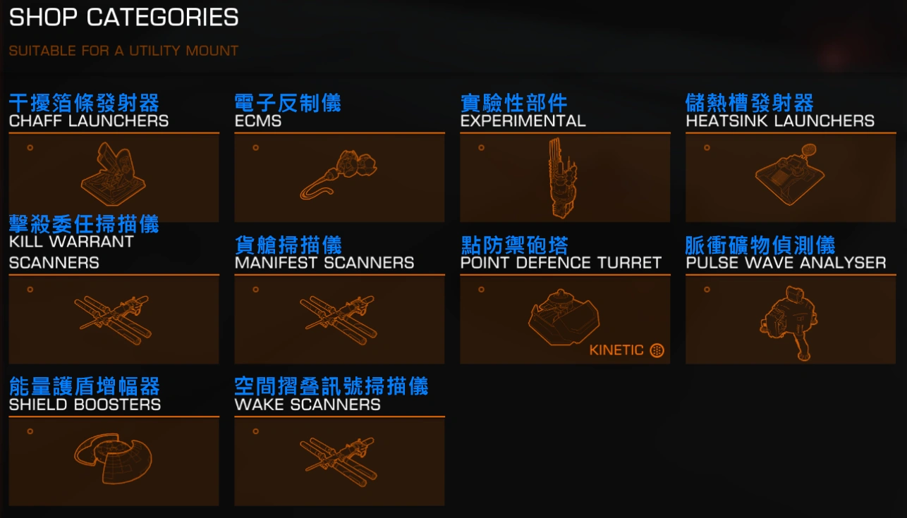 功能部件(Utility Module)是安裝於飛船外部的附屬部件,根據其安裝位置也被稱為外部部件,大多為一些掃描器或者防禦砲塔。它們有相同的重量(1.3噸,級別Class一律為1),且不區分評級(Rating)——即無A或E等級。